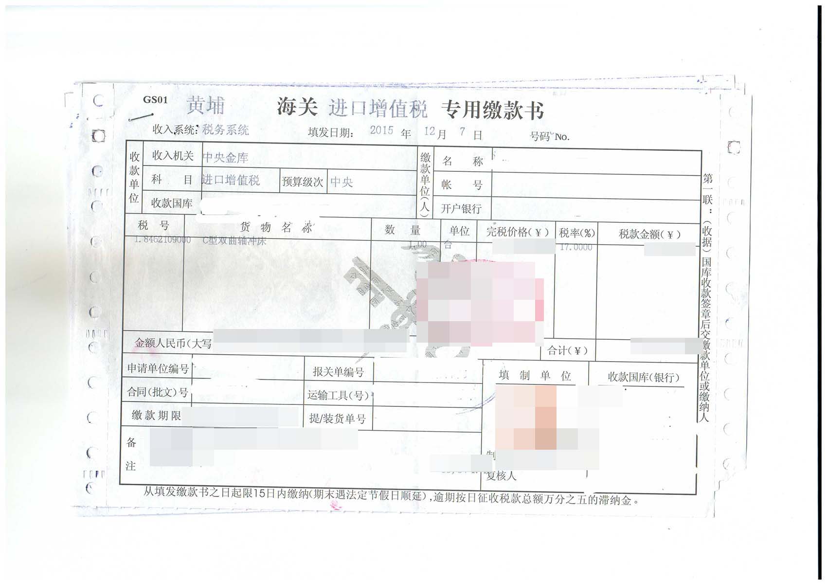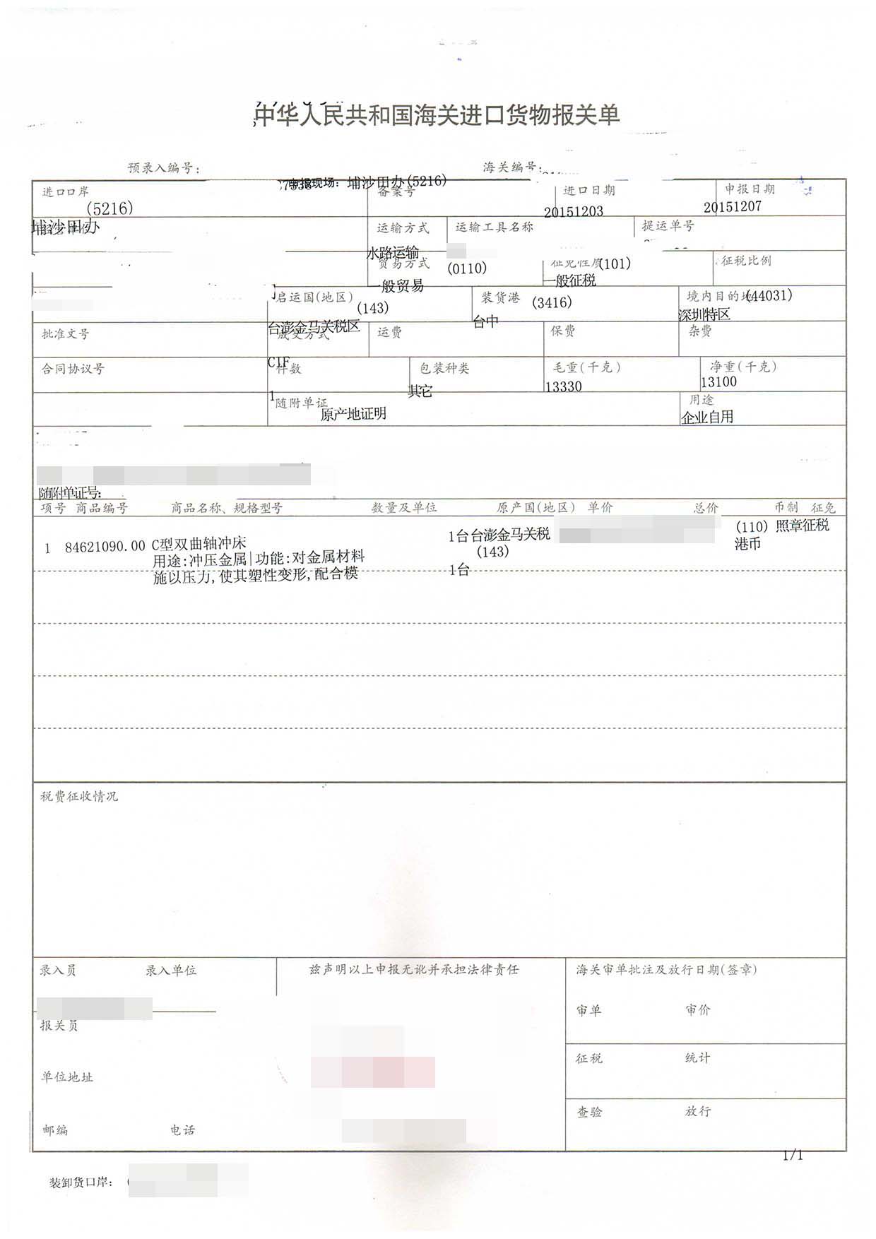 一、沖床進(jìn)口報(bào)關(guān)手續(xù)