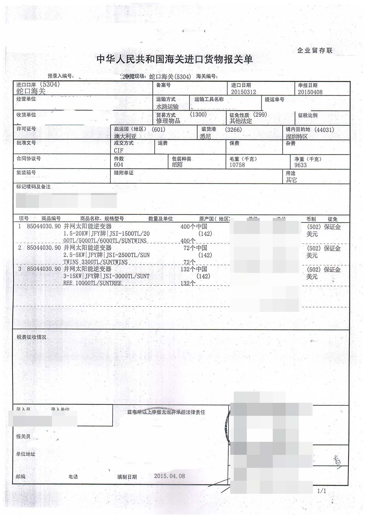 【文章標題】:并網太陽能逆變器進口報關案例 http://m.txht.com.cn/lm5/52.html 轉載請注明出處