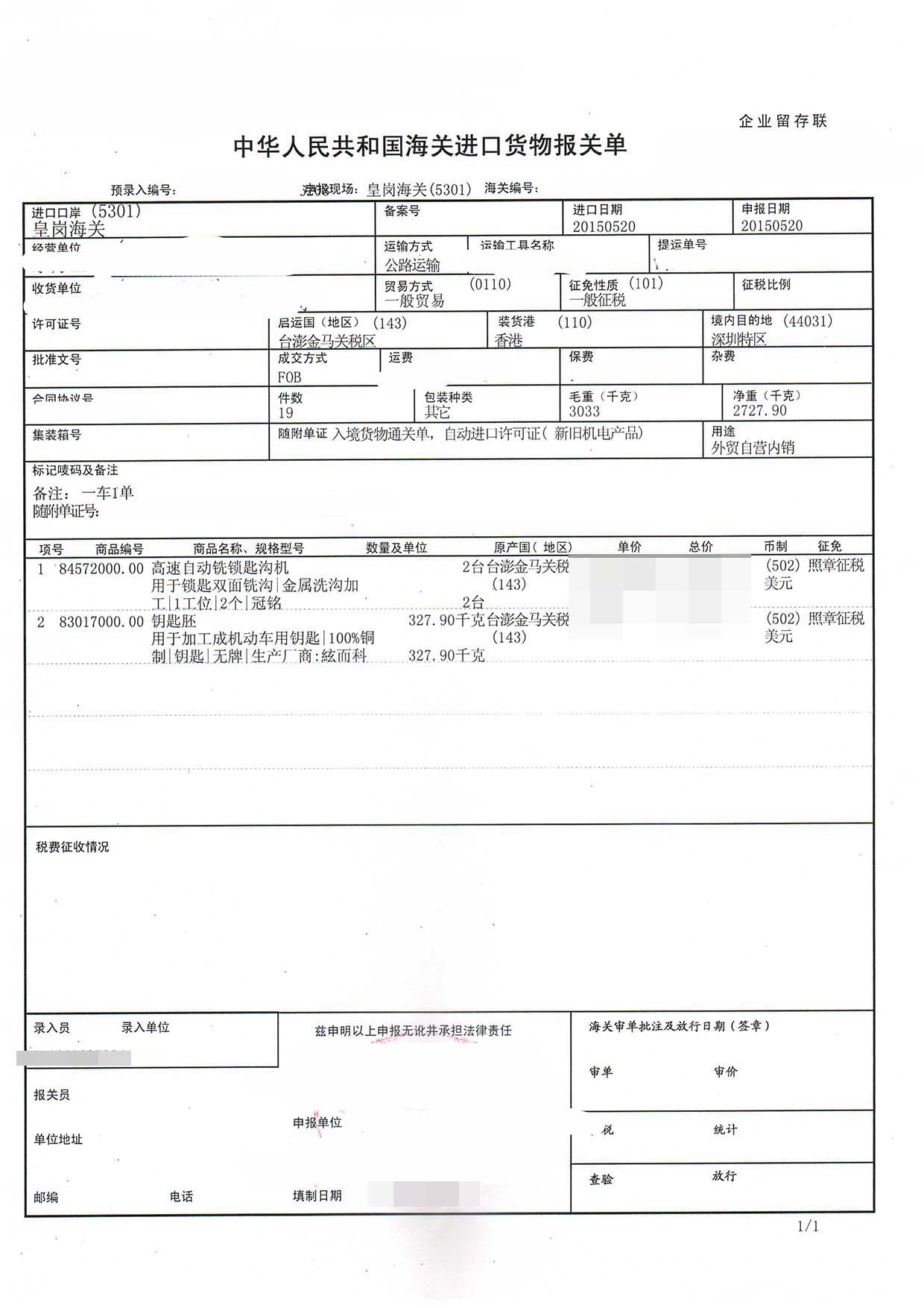 三、高速自動銑鎖匙溝機進口報關案例展示