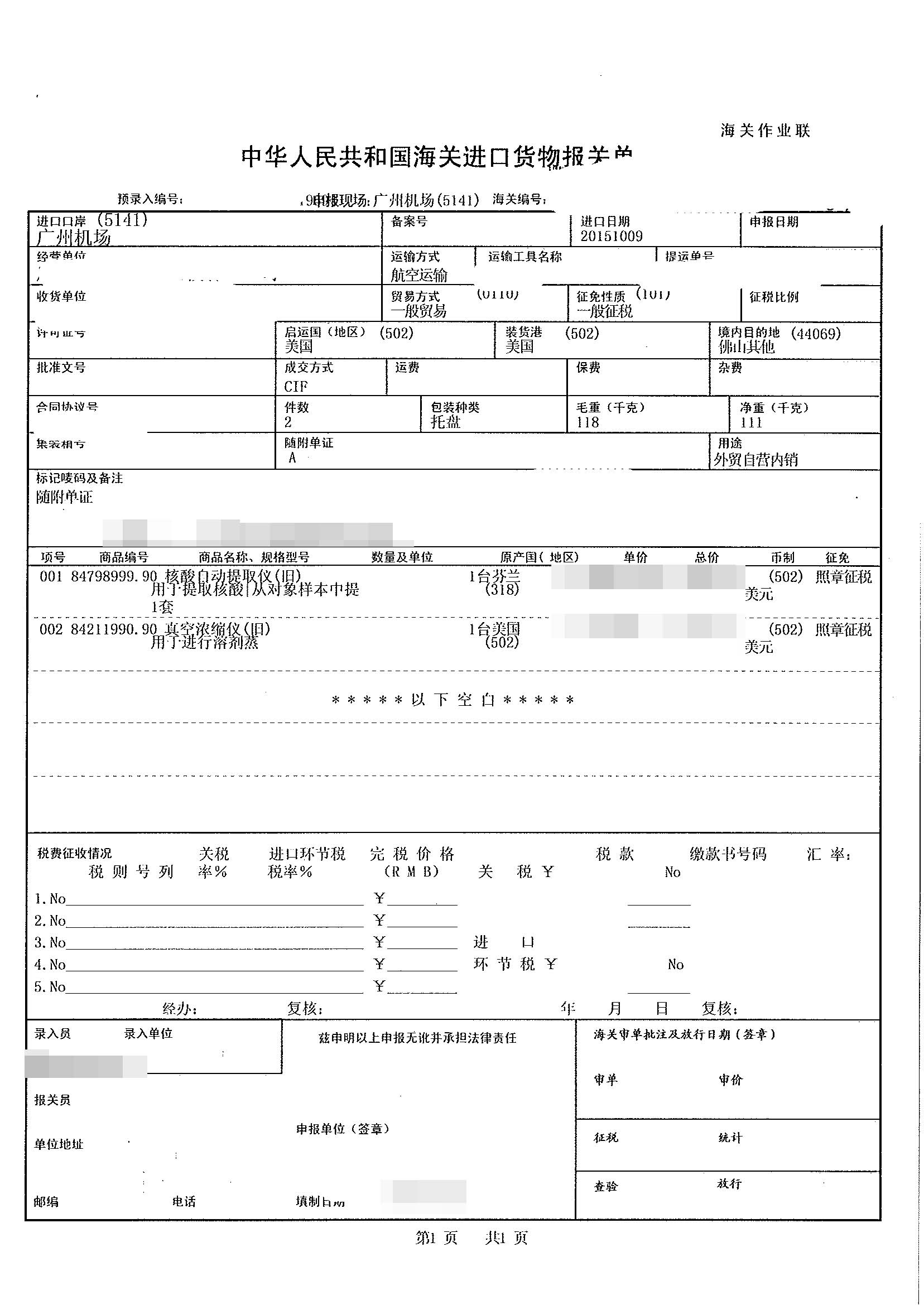 進口日期:20151009客戶:廣東某生物科技有限公司