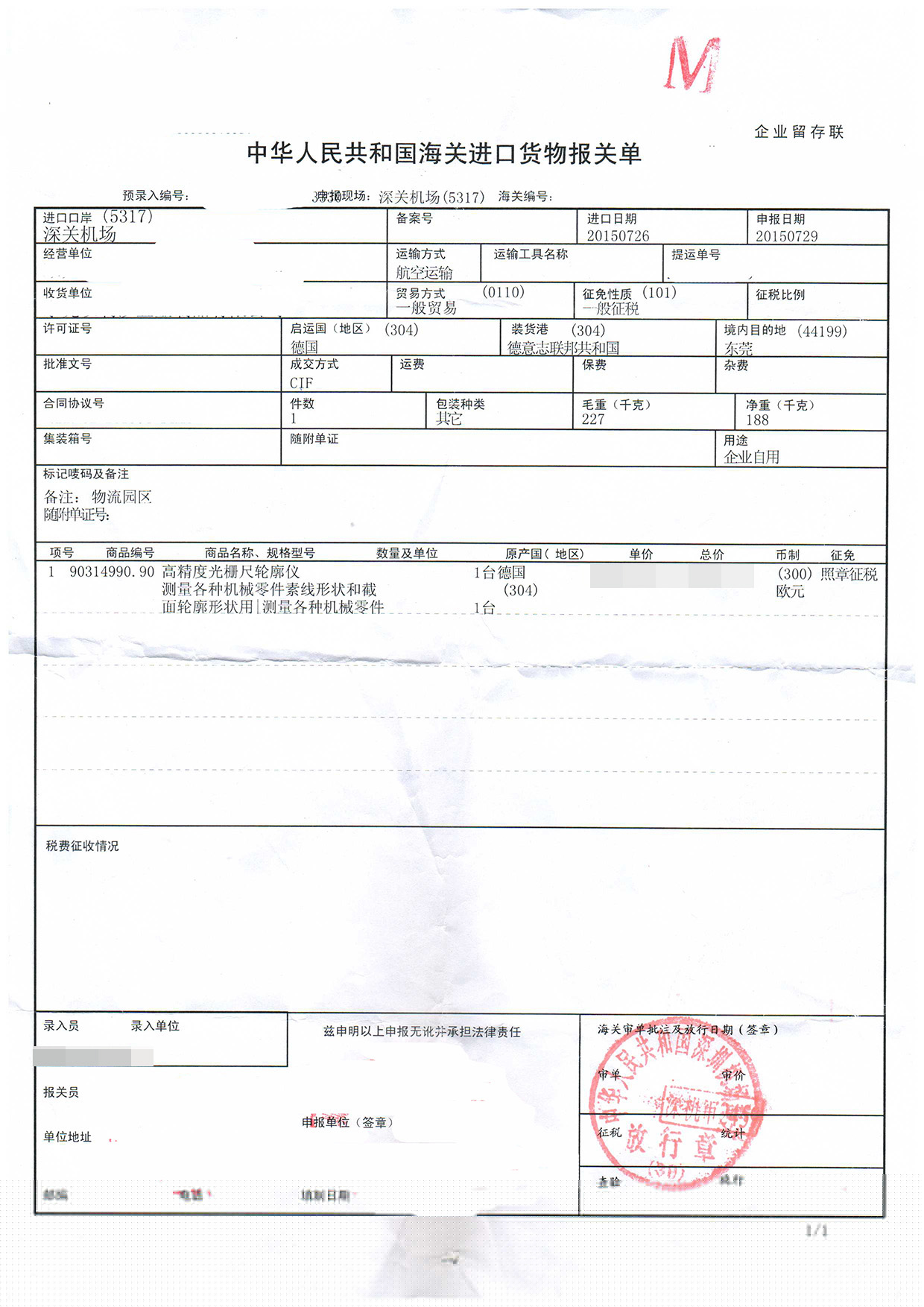進口日期:20150726客戶:東莞市某五金制品有限公司