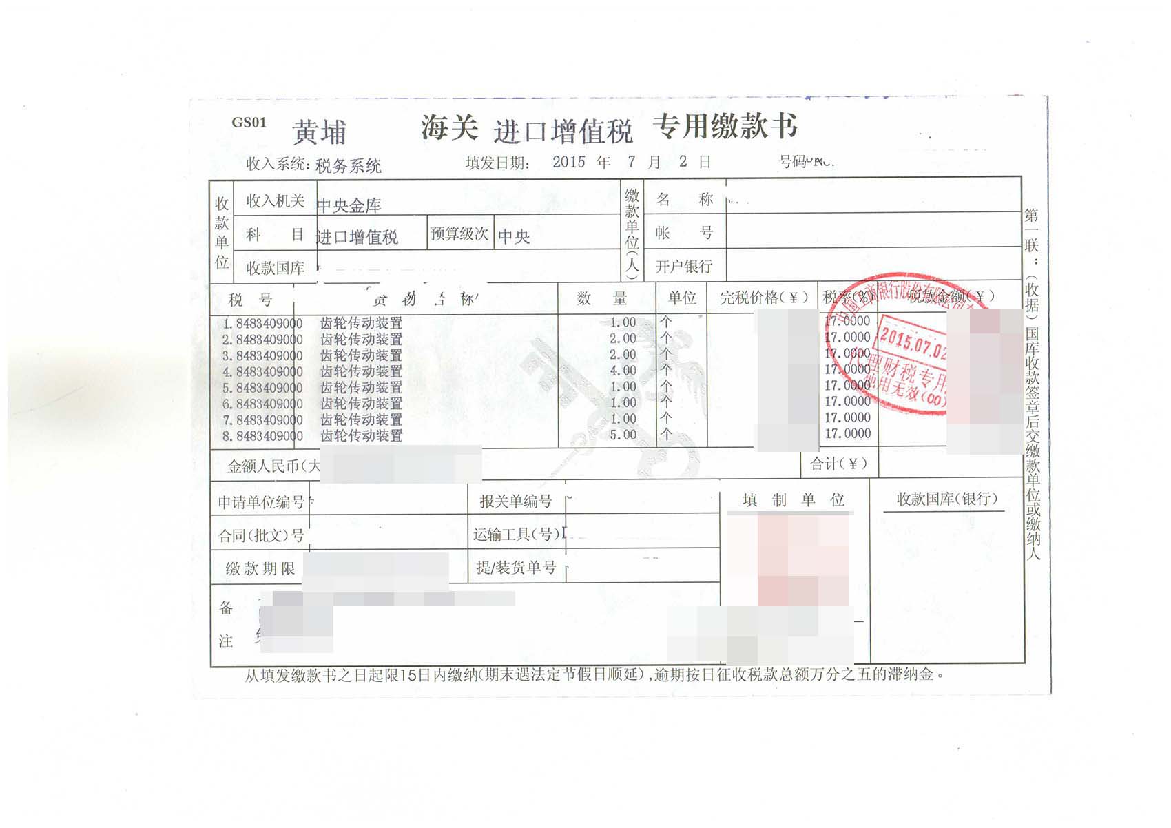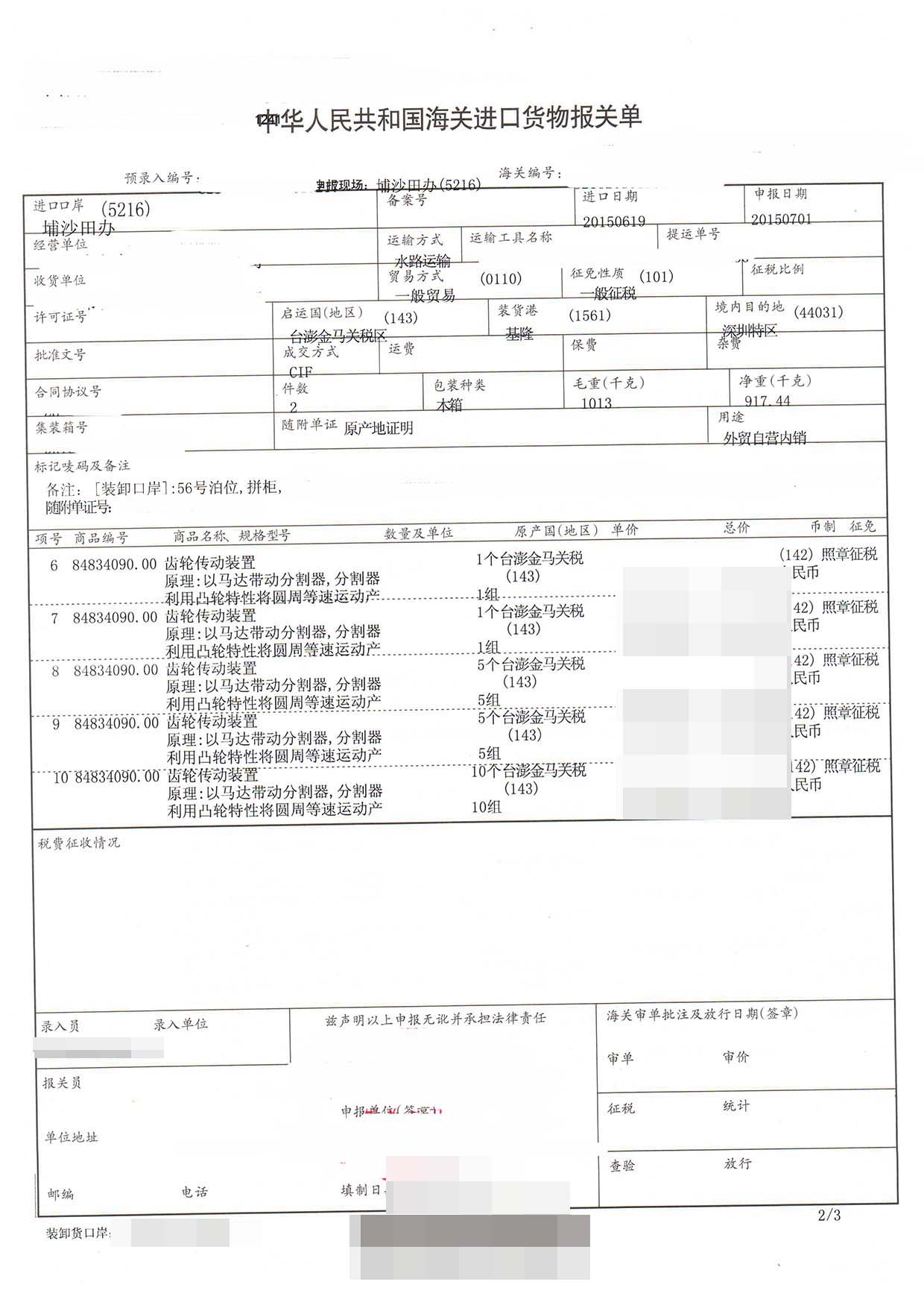 三、齒輪傳動裝置進口報關案例展示