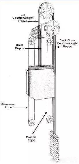 卷?yè)P(yáng)機(jī)由卷筒通過(guò)撓性件(鋼絲繩、鏈條)起升、運(yùn)移重物,卷?yè)P(yáng)機(jī)驅(qū)動(dòng)之電梯屬GB/T 7024-2008中強(qiáng)制驅(qū)動(dòng)電梯的一種。